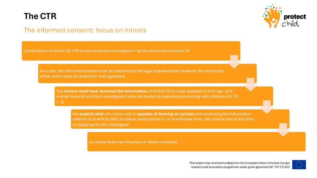 In pediatric trials, informed consent is legally provided by the child’s designated legal representative (usually a parent or tutor). However, researchers are legally obligated to actively assess the mental maturity of the minor and include them in the process.